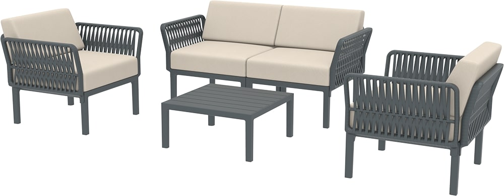 Portofino Lounge Set to funkcjonalny zestaw wypoczynkowy przeznaczony do nowoczesnych przestrzeni zewnętrznych i wewnętrznych. Solidna konstrukcja wykonana z żywicy wzmacnianej włóknem szklanym gwarantuje odporność na warunki atmosferyczne, wilgoć i promieniowanie UV, dzięki czemu meble zachowują kolor i formę przez lata, bez konieczności konserwacji. Brak elementów metalowych eliminuje ryzyko rdzewienia, a lekka forma ułatwia przenoszenie i aranżację. Oparcia i podłokietniki wyposażone są w bezśrubowy system mocowania, co pozwala na szybki montaż i demontaż bez narzędzi. Ażurowe boki dodają zestawowi charakterystycznej, lekkiej i współczesnej estetyki. Wygodne poduszki zapewniają komfort zarówno podczas krótkiego odpoczynku, jak i długiego relaksu. Data wydania - 01.2026.